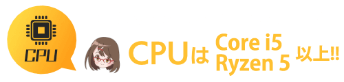 パソコンの頭脳です!ゲームプレイにおける処理速度を左右する重要なパーツとなります。CPU性能が低いとカクツキやラグが出るので高性能CPUがオススメ。ゲーミングパソコンのCPUは【Core i5またはRyzen 5】以上を選びましょう!